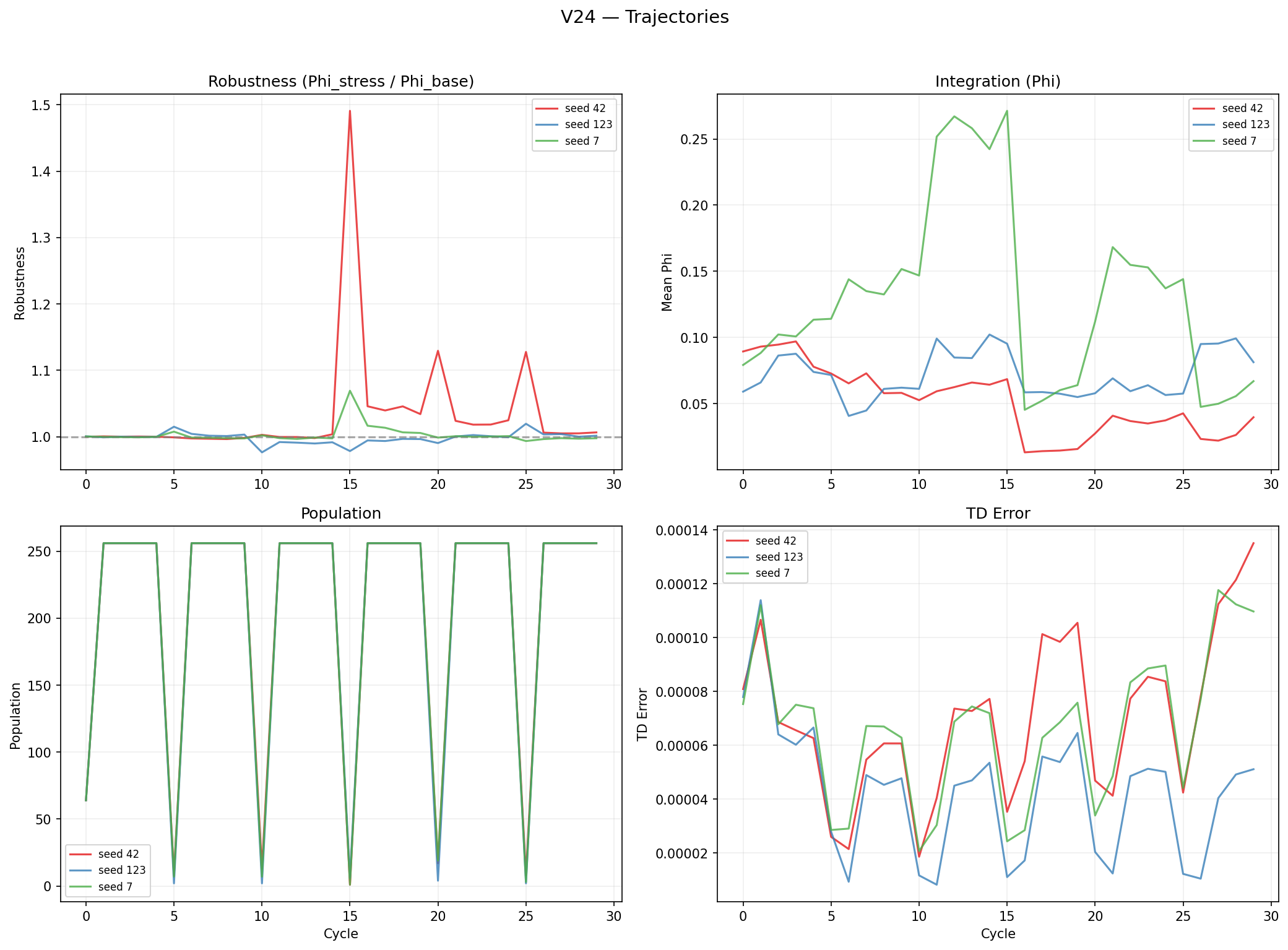 V24 evolution trajectories. Top-left: robustness with dramatic spikes at drought boundaries (up to 1.5) — the highest transient robustness of any prediction experiment. Top-right: Φ shows the widest variance (0.02–0.25), with seed 7 reaching high values mid-evolution before declining. Bottom-left: population dynamics. Bottom-right: TD error decreases over evolution — value learning works, but doesn't force integration because the linear readout is decomposable.V22–V24 prediction experiment comparison. Left: mean robustness. V24 (TD value) achieves the highest (~1.01), crossing the 1.0 threshold. V22 and V23 cluster below 1.0. Right: mean Φ. All three experiments overlap in the 0.06–0.10 range with high per-seed variance. Individual seed dots show no experiment consistently outperforms the others. The prediction target (scalar energy, multi-target, temporal value) does not reliably change integration — only architecture does (see V27).